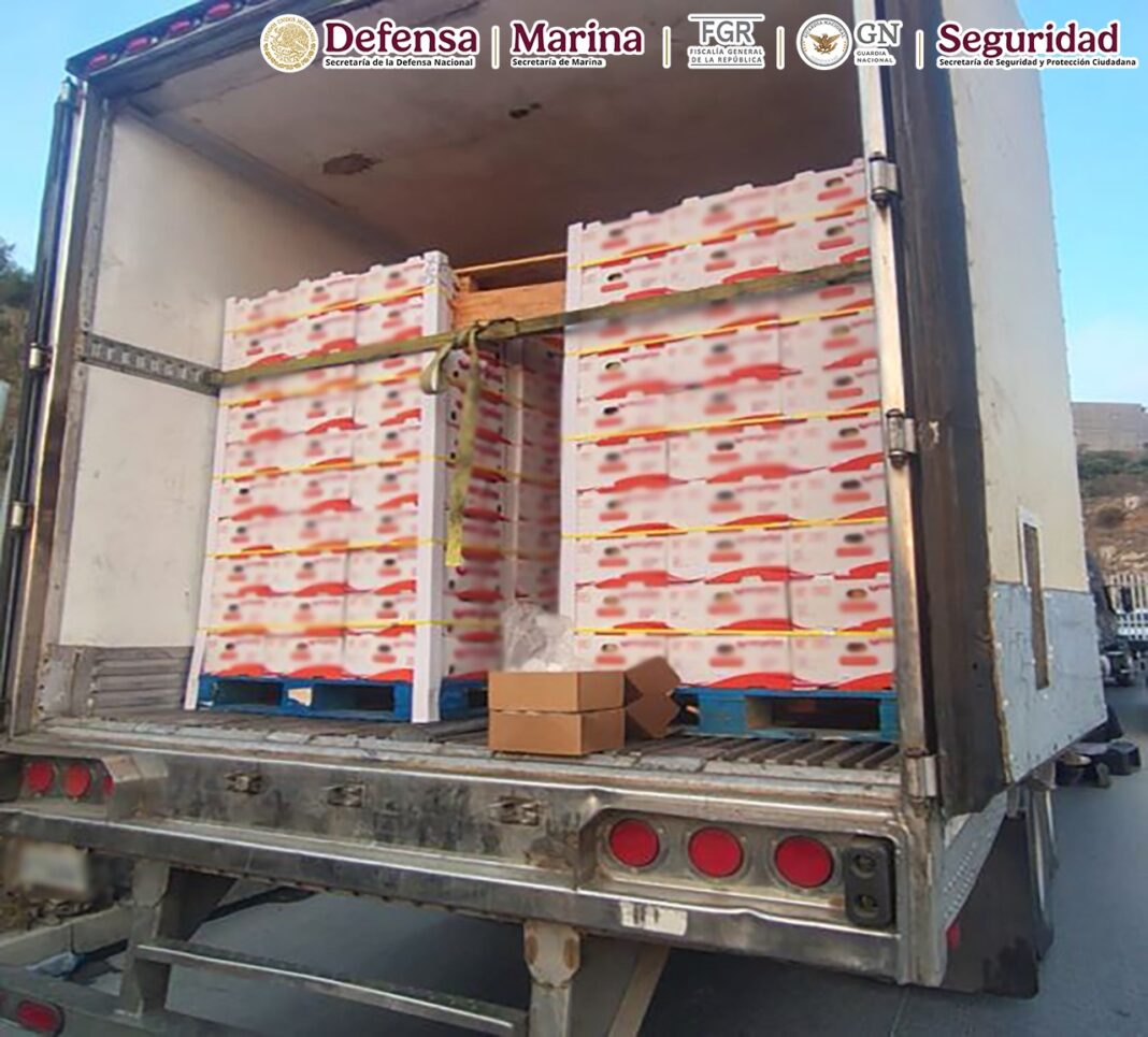 Los efectivos de seguridad, al estar en un puesto de inspección en el Boulevard 2000 en la colonia Hacienda, en Tijuana, le marcaron el alto a un tractocamión acoplado a una caja refrigerada procedente de Sinaloa, que transportaba cajas con tomate, para realizarle una revisión precautoria, durante la cual hallaron modificaciones en la parte inferior de la caja que no correspondían con su estructura original. En su interior localizaron 564 paquetes con 1,140 kilos de metanfetamina.