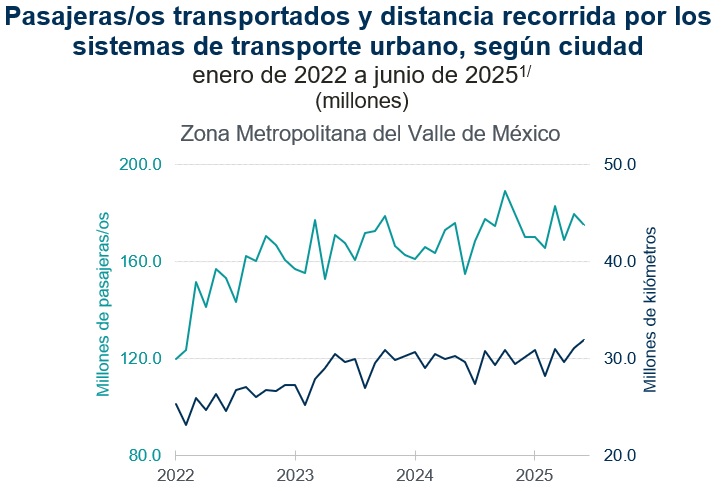 Durante junio de 2025, el sistema de transporte urbano de la Zona Metropolitana del Valle de México (conformado que se integra por las 16 alcaldías de la Ciudad de México y los municipios conurbados del Estado de México con los que se comparte transporte), prestó servicio a 175.1 millones de pasajeras y pasajeros, cantidad 12.9 por ciento superior a la del mismo mes de 2024.