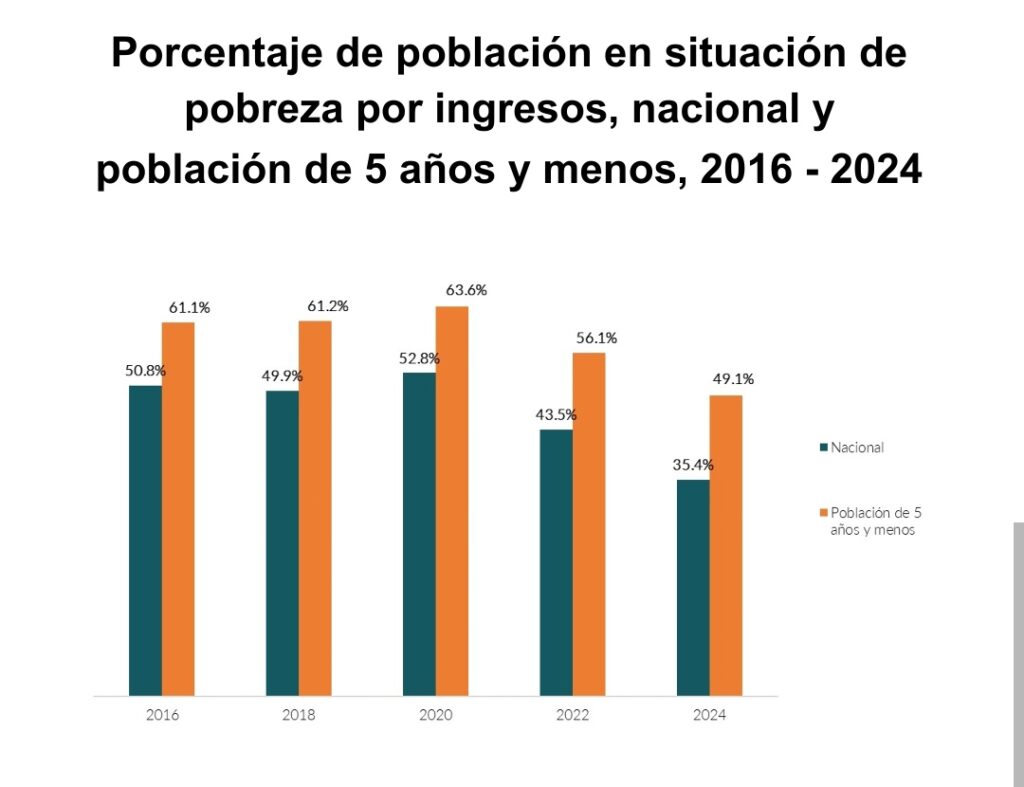 La reducción fue menor que la observada en la población general, donde la pobreza por ingresos pasó de 50.8 % en 2016 a 35.4 % en 2024. Esto significa que, pese a los avances, en 2024 la pobreza infantil superó en casi 14 puntos porcentuales a la del resto de la población (mientras que en 2016 la brecha era de casi 10 puntos porcentuales).