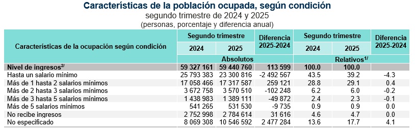 En cuanto a la población subocupada (las personas que tienen necesidad y disponibilidad de ofertar más horas de trabajo de lo que su ocupación actual les permite), sumó 4..3 millones de personas durante el segundo trimestre del presente año. Dicho dato resulta 60 mil menos que lo reportado en el mismo trimestre de 2024.