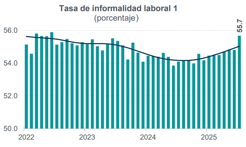 Y lo anterior, porque en julio de este 2025 la población ocupada en la informalidad laboral sumó 34.1 millones de personas, con lo que la tasa de informalidad laboral se estableció en 56.1 por ciento de la población ocupada, lo que significó un incremento de 1.6 puntos porcentuales respecto al 54.5 por ciento alcanzado en igual mes de 2024, de acuerdo con datos del Instituto Nacional de Estadística y Geografía (INEGI).