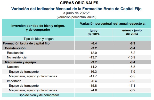El Instituto Nacional de Estadística y Geografía (INEGI), informó que durante junio de este 2025 la inversión privada, medida a través del Indicador Mensual de la formación Bruta de Capital Fijo (IMFBCF), reportó una caída de -6.4 por ciento con respecto al mismo mes de 2024, con lo que ligó 10 caídas a tasa anual, lo que representó la mayor cantidad de tropiezos consecutivos desde inicios de 2021, en el marco de la suspensión de actividades por el brote del COVID19.