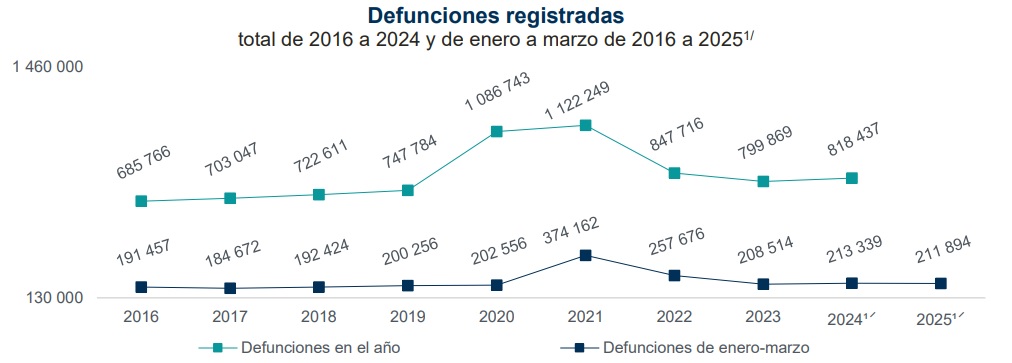 Para dimensionar el actual comportamiento de las defunciones en México, cabe recordar que en 2016 se registraron en el primer trimestre del año 191 mil 457 decesos, es decir, dos mil 127 casos en promedio al día, es decir, 227 casos menos que los reportados hoy en día.