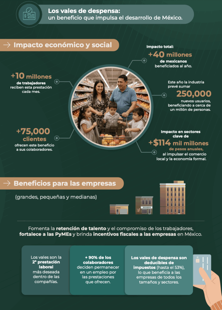 De acuerdo con dicha agrupación, los vales de despensa generan un impacto de $114 mil millones de pesos anuales en sectores clave de la economía. Asimismo, el monto promedio por persona es de $1,200 pesos mensuales, lo que genera una derrama económica estimada en $12 mil millones de pesos cada mes. Esta prestación alcanza de forma indirecta a más de 40 millones de integrantes de familias, así como pequeños comercios y cadenas de suministro en todo el país.