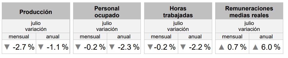En esa misma tónica las horas trabajadas en el sector manufacturero disminuyeron -1.2 por ciento en julio de este año con relación al mismo mes de 2024, mientras que la producción en dicha rubro retrocedió -0.4 por ciento.