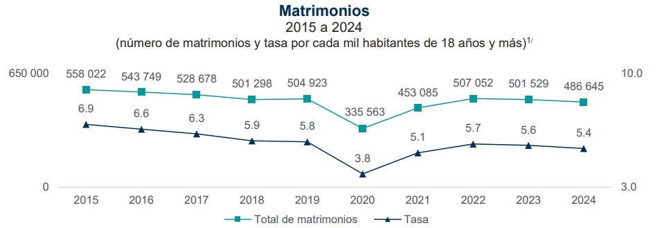 De acuerdo con el Instituto Nacional de Estadística y Geografía (INEGI), en la última década, los enlaces matrimoniales van con clara tendencia negativa. Resulta que mientras en 2015 se registraron 558 mil 022 matrimonios, 10 años después la cifra bajó a 486 mil 645, lo que significa un descenso de -12.9 por ciento, es decir, 71 mil 377 menos celebraciones en dicho lapso.