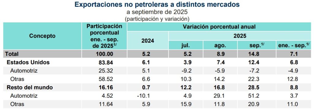 Por medio de un reporte, el organismo autónomo precisó que las exportaciones mexicanas no petroleras que tuvieron como destino el mercado estadounidense crecieron 3.3 por ciento a tasa anual durante septiembre pasado. Con ello, en los primeros nueve meses del año aumentaron 7.1 por ciento con respecto al mismo periodo de 2024.