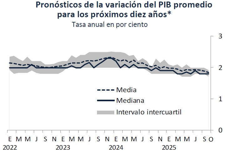 De acuerdo con los resultados de la Encuesta sobre las expectativas el sector privado, realizado por el Banco de México (BANXICO), y correspondiente a octubre, los analistas aprecian que el potencial de crecimiento de la economía mexicana para los próximos diez años será de apenas 1.8 por ciento anual, es decir, inferior a dos por ciento.