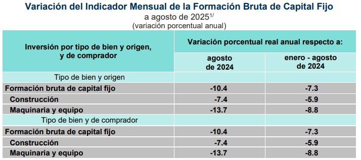 Por lo anterior, de enero a agosto de este 2025, la inversión global retrocedió -7.3 por ciento respecto al mismo periodo de 2024. A su interior, la inversión privada acumuló una baja de -5.4 y la pública -22.2 por ciento.