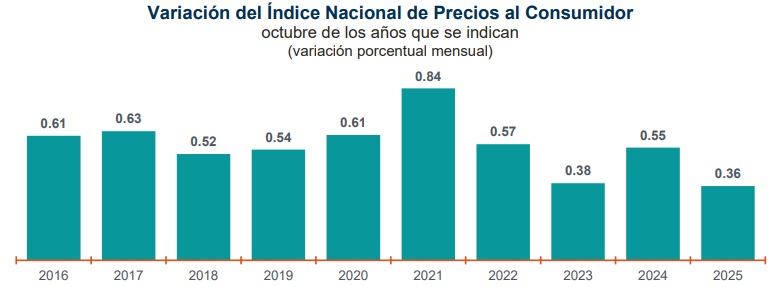 Para dimensionar el actual desempeño de la inflación, cabe recordar que en septiembre de 2024, el INPC mensual fue de 0.55 por ciento y la anual en 4.76 por ciento, mientras que en el mismo mes de este año dichos valores fueron 0.36 y 3.57 por ciento, en ese orden.