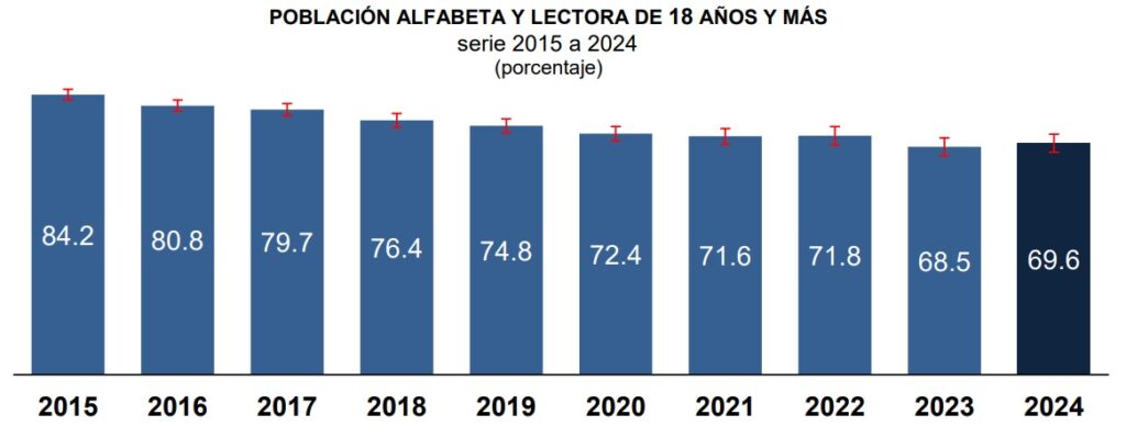 De acuerdo con los datos histórico del organismo autónomo, en 2015 la población alfabeta y lectora de 18 años y más representó 84.2 por ciento, mientras que 2018 el dato bajó a 76.4; para 2021 descendió a 71.6 y para 2024 bajó a 69.6 por ciento.