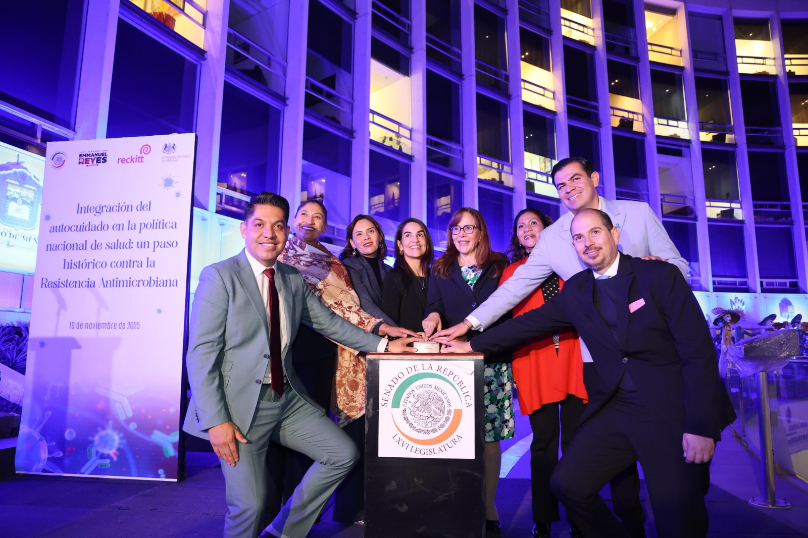 Para visibilizar la urgencia de actuar, el Senado de la República se iluminó de azul, color distintivo de la lucha contra la resistencia antimicrobiana, reforzando de manera simbólica el compromiso de México frente a este reto global.