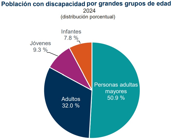 Según grupos de edad, poco más de la mitad de la población con discapacidad (50.9 por ciento) tenía 60 años o más, mientras que la población de infantes y jóvenes registró los porcentajes más bajos: 7.8 y 9.3 por ciento, respectivamente.