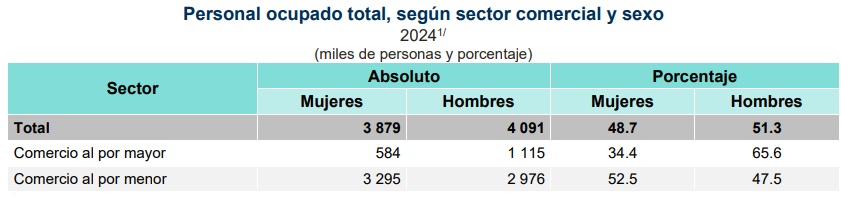 De acuerdo con el Instituto Nacional de Estadística y Geografía (INEGI), con datos al 2024, se cuantificaron seis millones 271 mil trabajadores en comercios al por menor, de los cuales, dos millones 976 mil son varones y tres millones 295 mujeres. De esta manera, 52.5 por ciento del personal correspondió al género femenino y 47.5 por ciento al masculino.