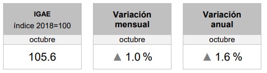 La actividad económica del país se mantiene débil, toda vez que en octubre pasado el Indicador Global de la Actividad Económica (IGAE), reportó un crecimiento de 1.0 por ciento respecto a septiembre, con lo que a tasa anual avanzó 1.6 por ciento, de acuerdo con datos ajustados por estacionalidad del Instituto Nacional de Estadística y Geografía (INEGI).