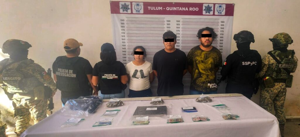 Tulum.- Policías de Investigación, adscritos a la Fiscalía General del Estado, en coordinación con elementos de la Secretaría de la Defensa Nacional y la Secretaría de Seguridad Ciudadana Municipal, detuvieron en flagrancia a dos masculinos y una femenina, por su presunta relación en hechos probablemente constitutivos de delitos contra la salud, en su modalidad de narcomenudeo, en este municipio.