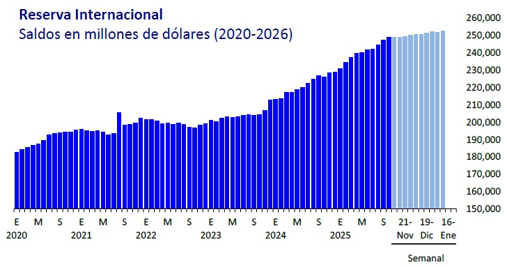 Las reservas internacionales del país comenzaron con el pie derecho este 2026, pues de acuerdo con información del Banco de México (BANXICO); al nueve de enero alcanzaron un saldo de 252 mil 564 millones de dólares, lo que implicó un aumento semanal de 736 millones de dólares.
