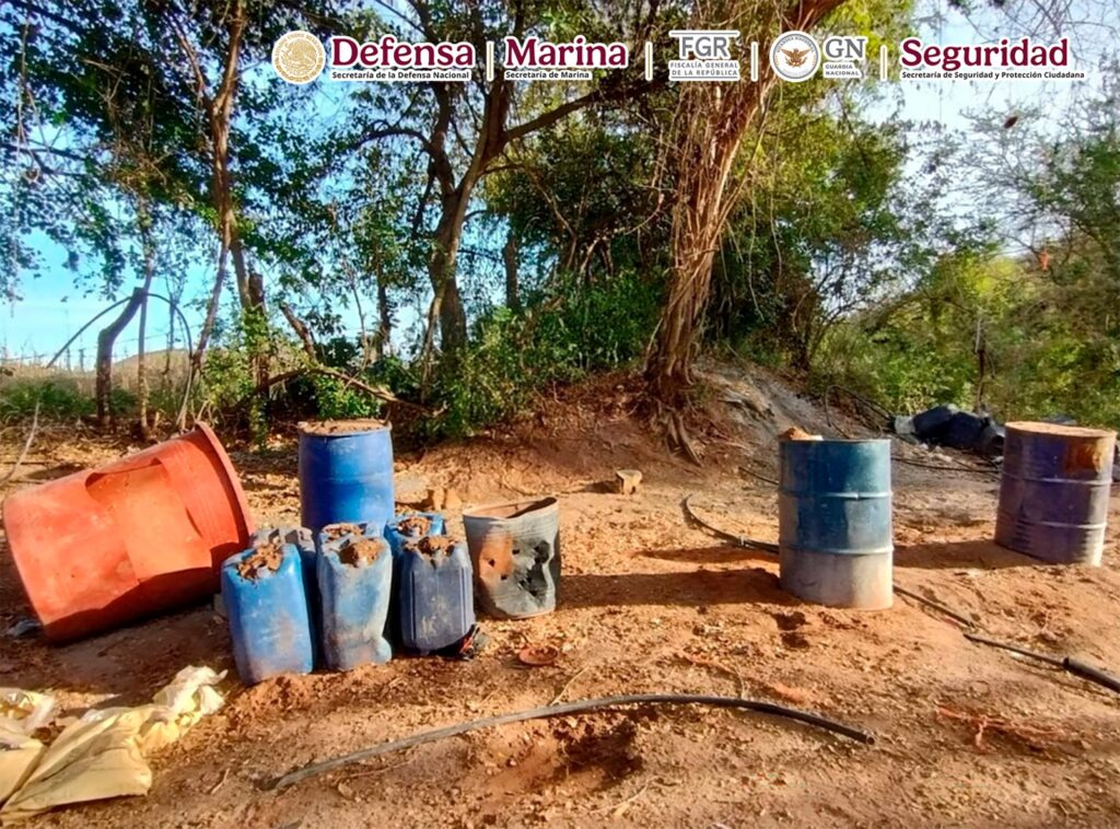 En otra acción, en Cosalá, Sinaloa, al realizar funciones de reconocimiento, se localizaron e inhabilitaron 11 áreas de concentración de material diverso para la elaboración de drogas sintéticas, se aseguraron 16,486 litros y 75 kilos de sustancias químicas.