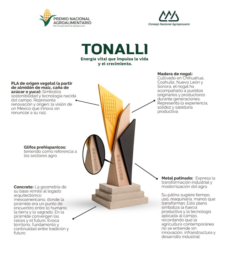 La nueva presea, ahora denominada Tonalli —palabra de origen náhuatl que significa energía vital— simboliza la fuerza que impulsa la vida, el crecimiento y la transformación del campo mexicano. Combina tradición e innovación. Integra técnicas ancestrales, como el tallado en madera y la fundición de metales, con procesos contemporáneos como la impresión 3D y el uso de materiales de nueva generación.