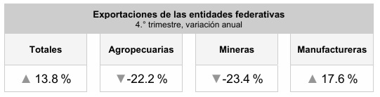 Por sector productivo, resultó que sobresalieron las exportaciones del sector manufacturero en Jalisco, Chihuahua, Nayarit, Sinaloa y Yucatán; las del sector minero, en Coahuila, Durango, Chihuahua, Sonora y Nuevo León; y las del agropecuario, en Campeche, Tlaxcala, Oaxaca y Yucatán