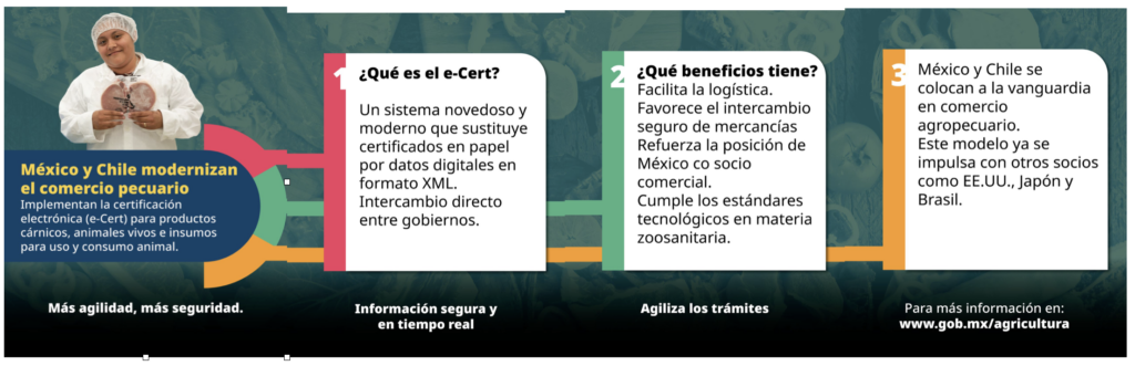 Esta nueva forma de intercambio de información, coloca a México y Chile como punta de lanza a nivel mundial en la materia, ya que agiliza los procesos de revisión, certificación y validación de mercancías, en beneficio de las y los exportadores pecuarios.